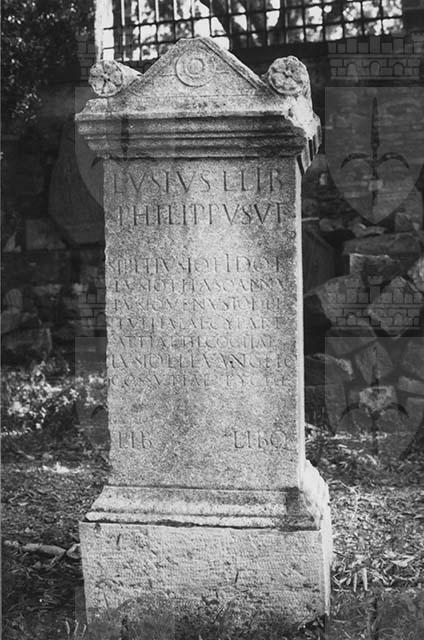 Blocco unito; Dado liscio; Iscritta fronte e retro; Base modanata; Coronamento modanato a timpano decorato da patera. Alle sue estremità sono presenti due pulvini lisci con volta a fiore; Il liberto (schiavo liberato) Lucio Usio Filippo realizza il monumento funebre, mentre è ancora vivo, per sé e per altri membri della famiglia. Ritrovamento presso Trieste, Campanile di San Giusto nel 1842; Acquisizione dal 1842; Conservato nell'Orto Lapidario, I ripiano, oggi risiede nel Lapidario Tergestino, Castello di San Giusto.