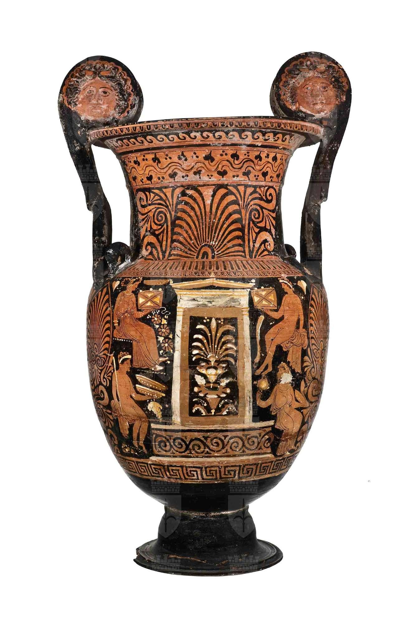 Cratere a volute con mascheroni con anse terminanti a teste di cigno; apulo a figure rosse. Lato A: defunto eroicizzato: su un basamento modanato, in un'edicola frontale, sta un giovane guerriero stante e tiene alla briglia un cavallo; ai lati quattro offerenti seduti rivolti al centro. Lato B: al centro un'edicola contenente due fiori campanulati sovrapposti e palmetta; ai lati quattro offerenti seduti.