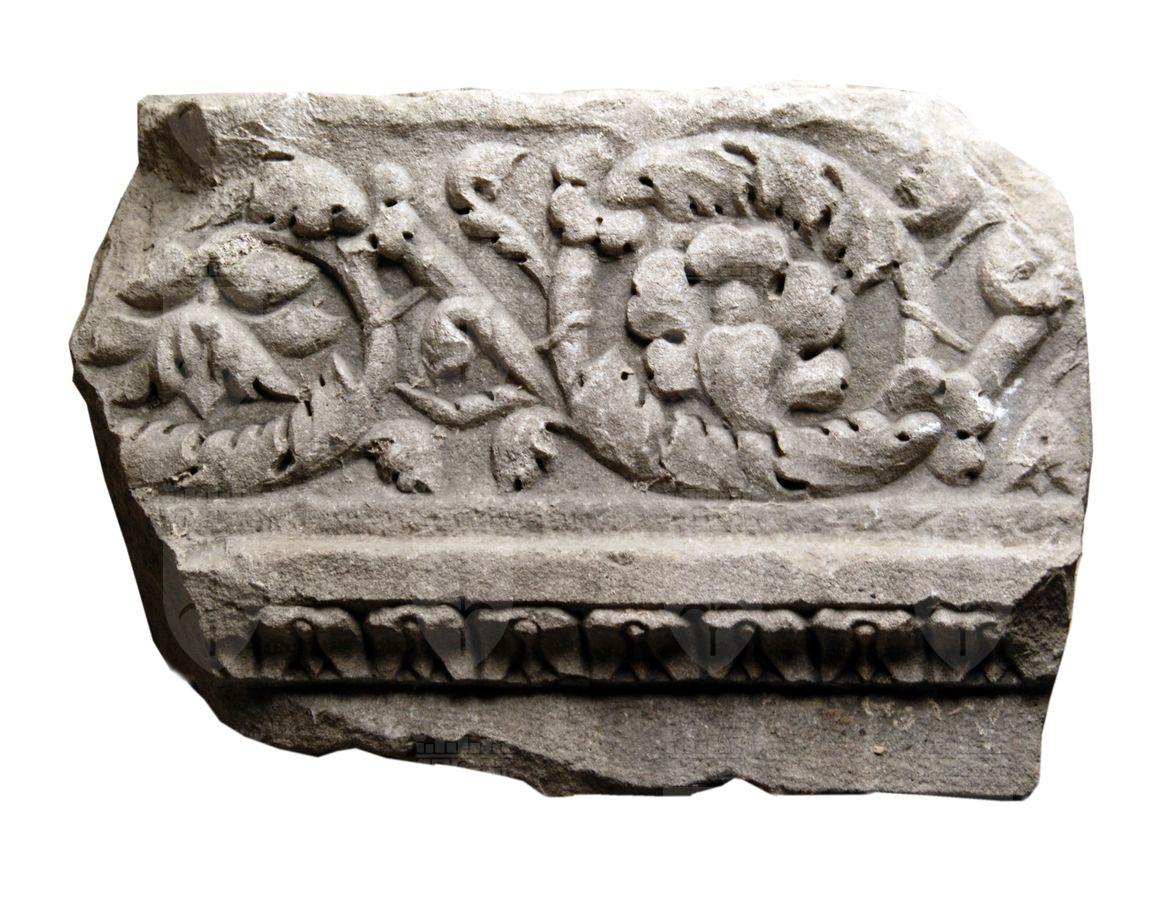 Frammento di elemento architettonico con fascia a kyma lesbico continuo sormontato da un rilievo a girali vegetali appartenuto probabilmente alla trabeazione della basilica civile