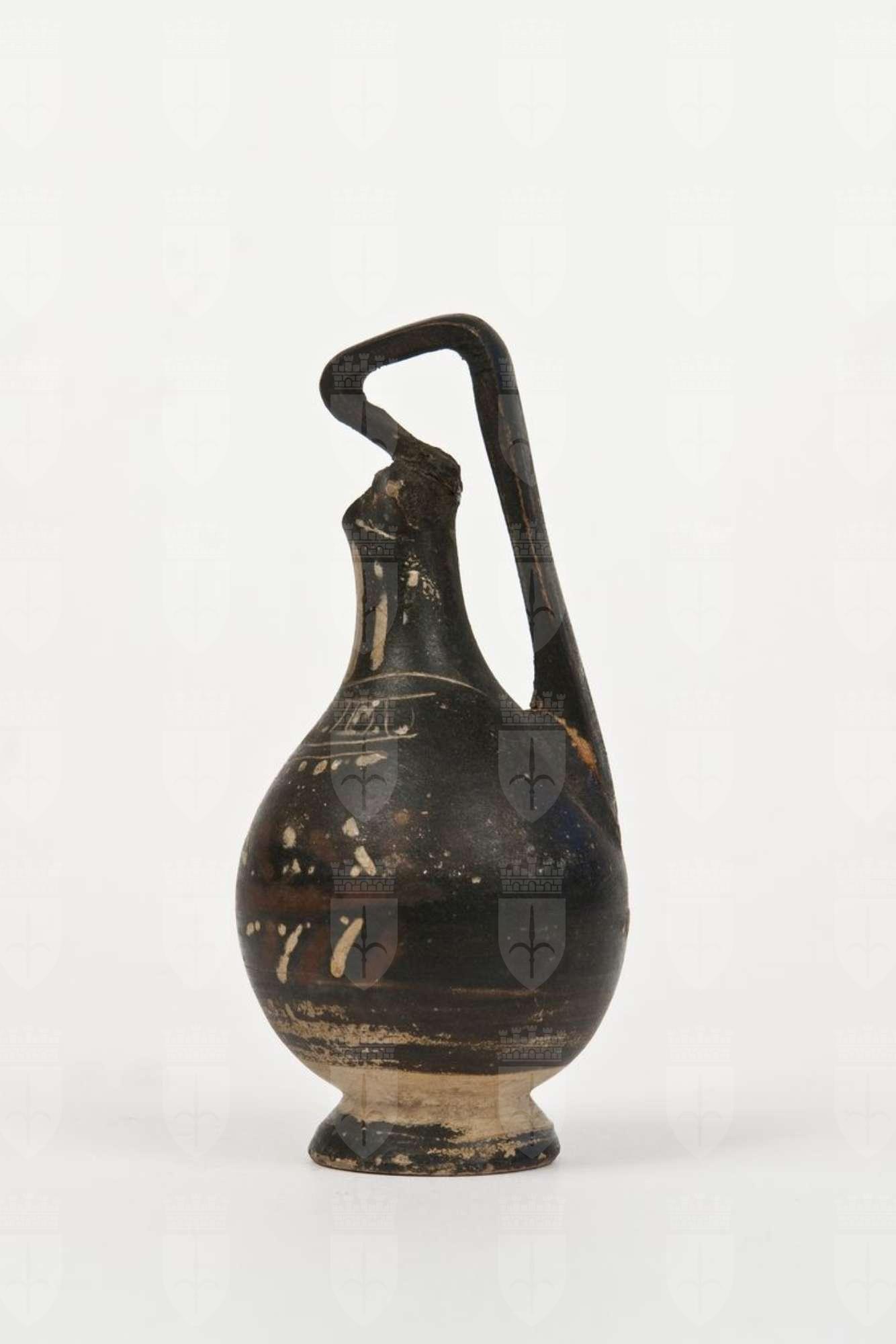 Epichysis a vernice nera opaca con sovraddipinture in bianco, giallo e rosso amaranto ed incisioni. Bocchello a labbro revoluto, collo cilindrico, corpo piriforme schiacciato in basso, ansa a nastro sormontante, gola di raccordo, piede troncoconico modanato al taglio. Sul collo: sequenza di bastoncelli dipinti in bianco crema, seguono, inquadrati da due linee incise, ovuli dipinti ed incisi con punti; mentre sulla spalla vi è una fila di punti. Sul corpo: ramo di alloro, con stelo in rosso amaranto e foglie bianche e rosse alternate a file di piccole bacche bianche disposte a ramoscello; le foglie sono convergenti al centro verso una rosetta.