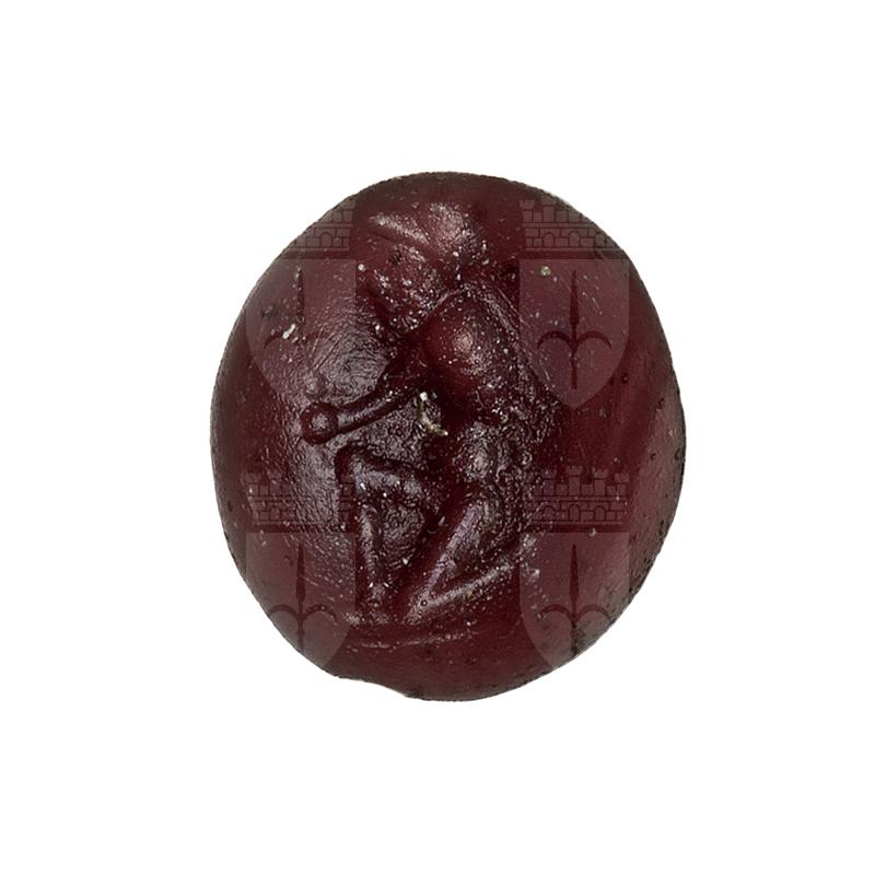 Gemma ovale, convessa, piana. Uomo inginocchiato a destra tira su con la lenza un pesce. Linea di terreno.