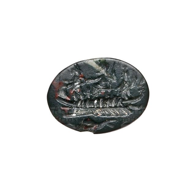 Gemma ovale, piana. Nave a remi sulla quale a poppa Fortuna con cornucopia a destra, nel mezzo una figura seduta a destra con la destra appoggiata allo scettro, nella sinistra protesta la patera, sopra l'aquila? A destra altra figura; sotto la nave delfini natanti a destra. Da Aquileia?