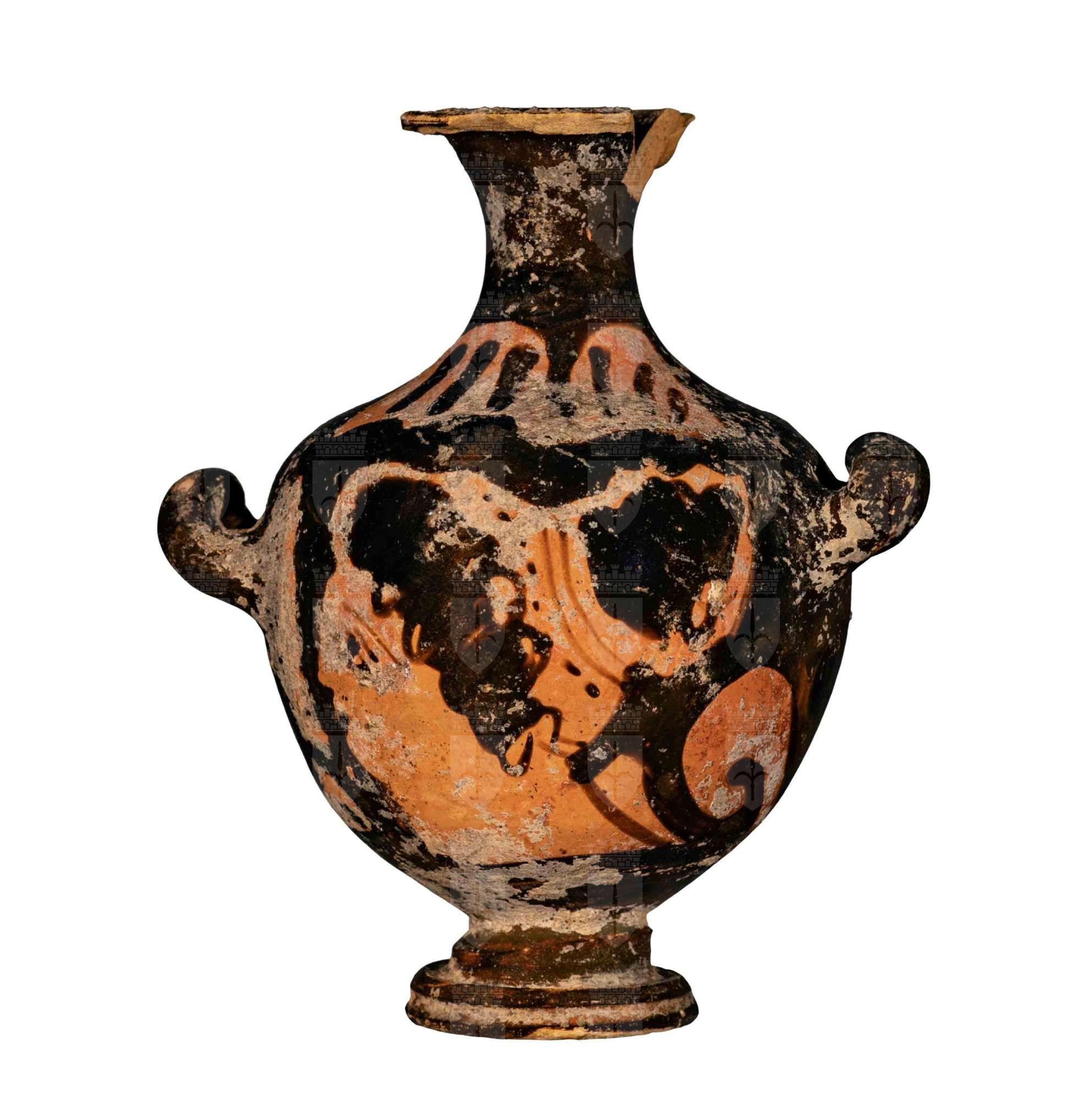 Hydria miniaturistica. Orlo estroflesso con labbro ripiegato; collo a profilo concavo; spalle oblique; corpo globulare; con testa femminile di profilo verso sinistra; fronte e naso costituiti da un’unica linea continua, leggermente arcuata in corrispondenza della fronte. Occhio con dettaglio di sopracciglio, rima superiore e inferiore aperte e pupilla pendente dalla rima superiore. La narice lasciata non caratterizzata; labbro superiore e inferiore apparentemente distinti per mezzo di una breve linea (ora del tutto abrasa). I capelli ricci sono raccolti in una mitra decorata presso i bordi con due semplici linee continue in vernice nera molto diluita e, centralmente, da una fila di puntini in vernice nera. Contornano la figura in basso, ai lati, elementi vegetali.