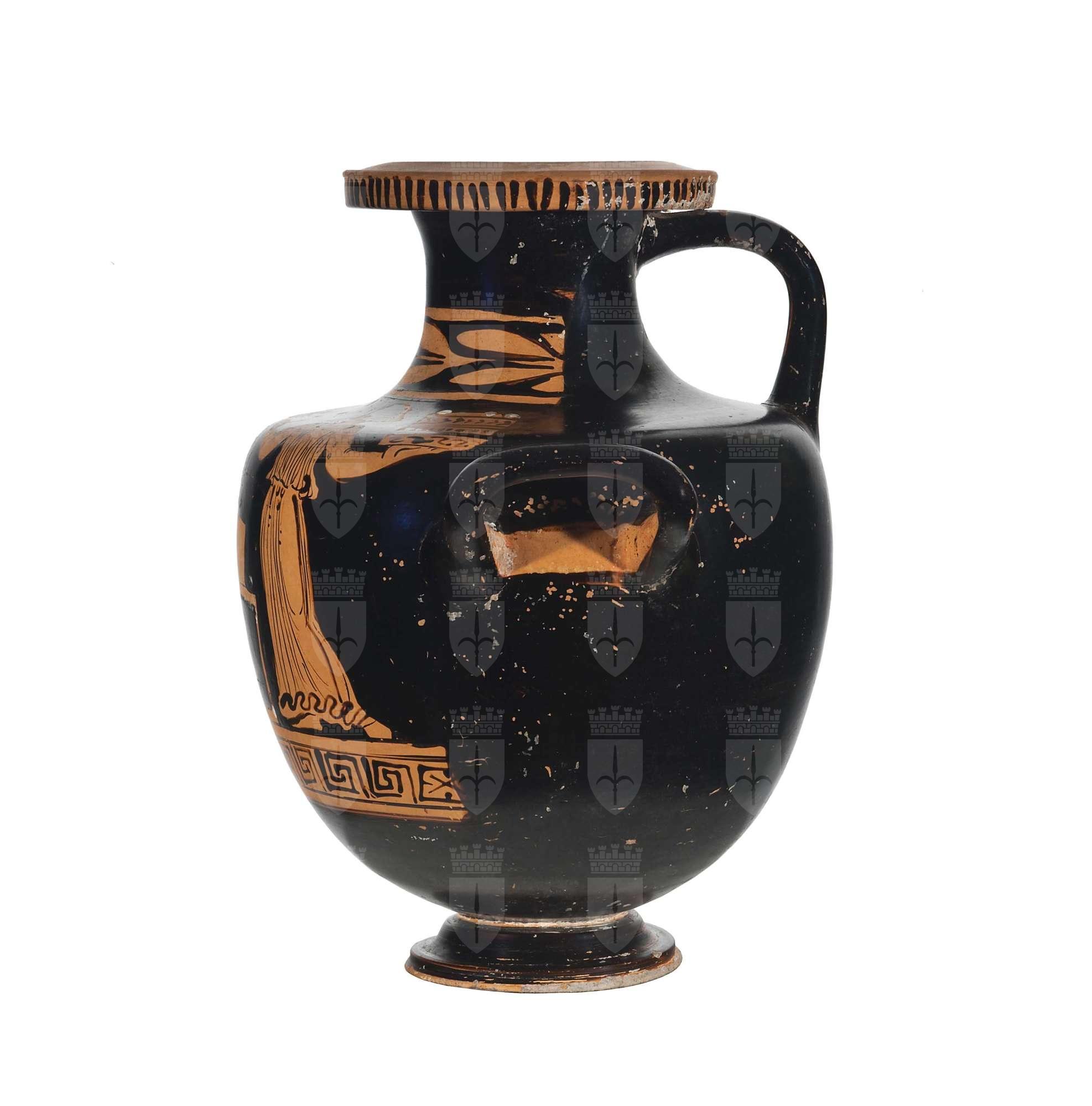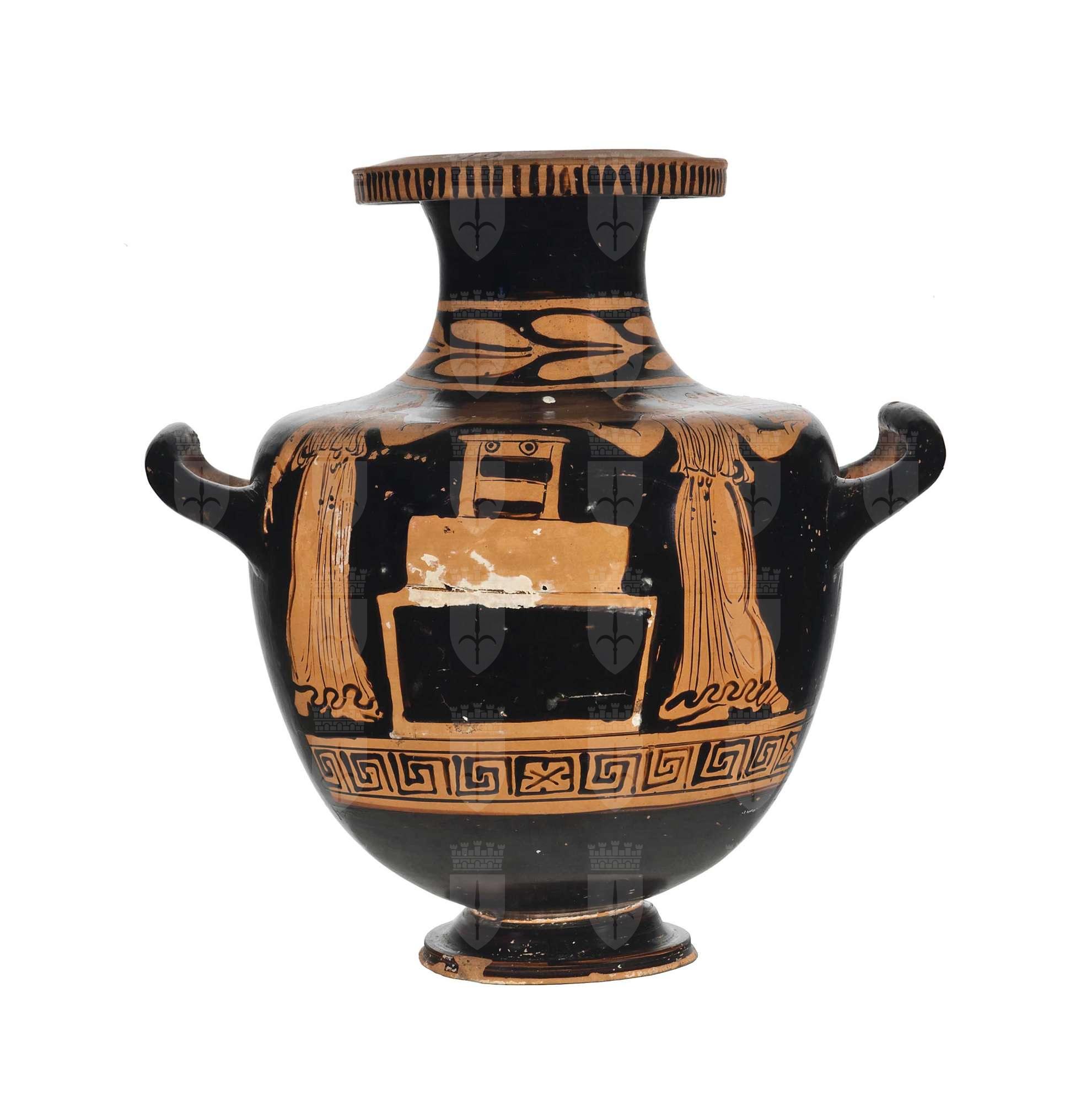 Hydria apula a figure rosse con scena d'offerta: due donne in chitone volte verso un'ara rettangolare con cofano soprastante.