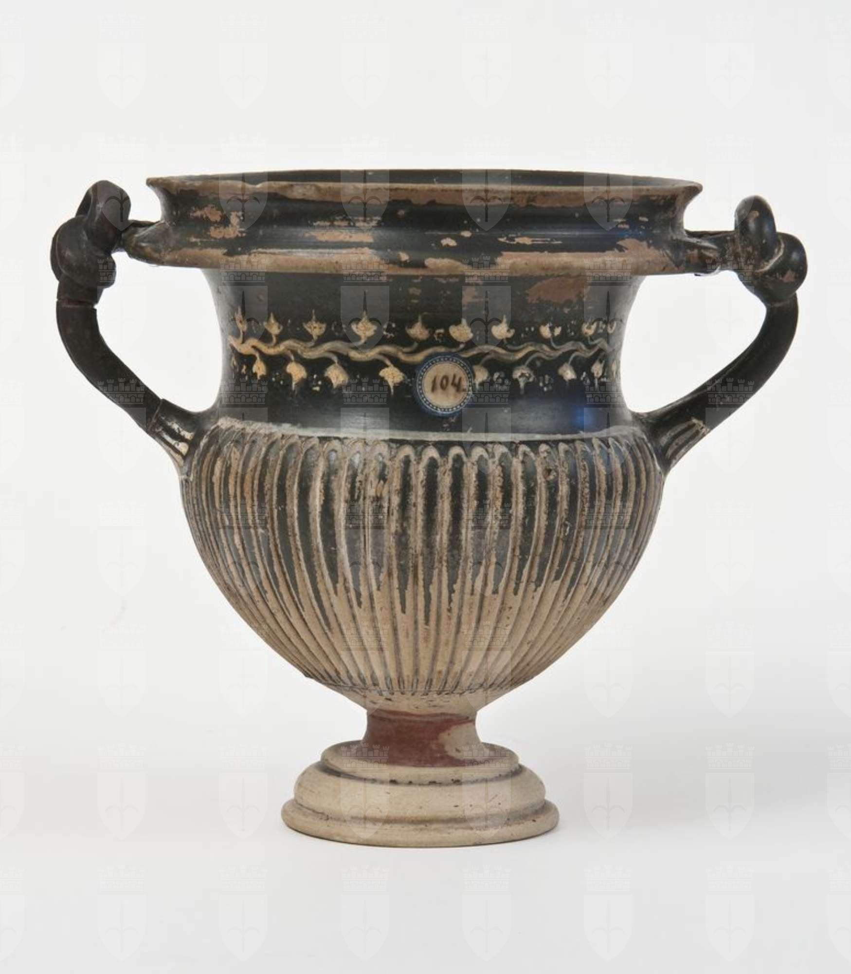Kantharos a vernice nera con sovraddipinture in bianco e giallo. Spesso labbro revoluto, quasi bifido, orlo estroflesso, corpo a profilo concavo-convesso, strigilato, anse a nastro bifido, verticali, annodate all'estremità superiore, gola di raccordo, piede troncoconico cavo, sagomato all'esterno. Lato A e B: Sulla fascia liscia, sopra il corpo strigilato, tralcio di edera con stelo sinuoso dipinto e rosette di punti in giallo su base bianca. Le anse presentano alla base una fila di bastoncelli in giallo, pendenti da una linea orizzontale in bianco. Il piede è sovraddipinto con fila di punti, in bianco.