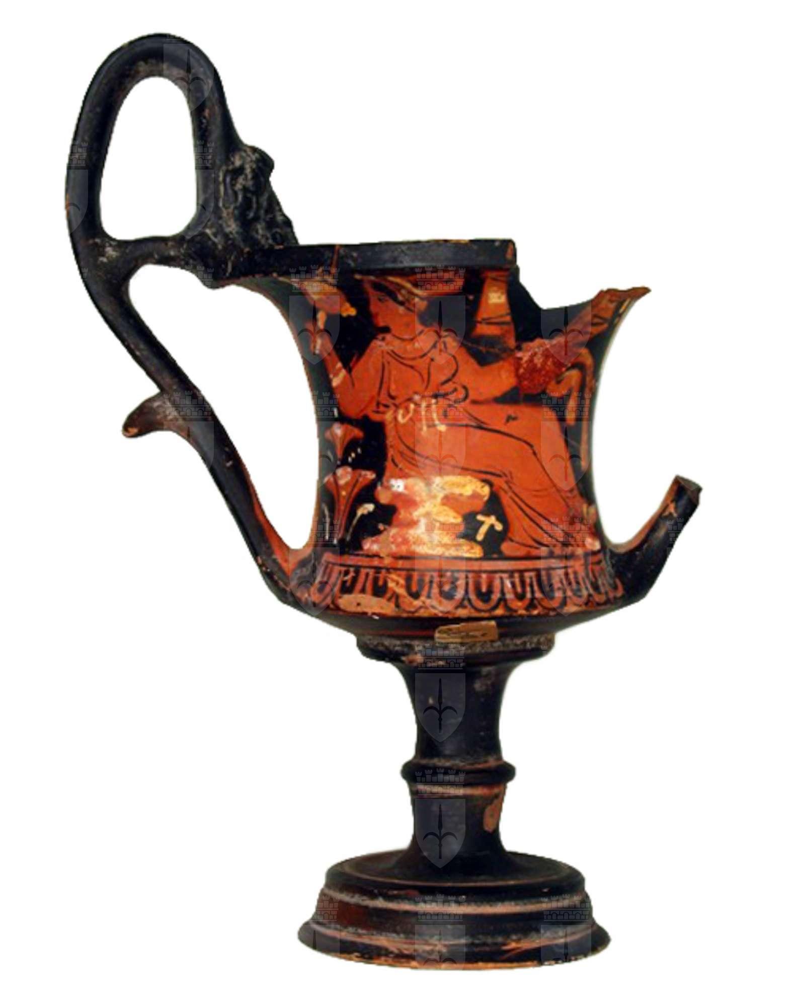 Orlo svasato con labbro estroflesso; bicchiere a profilo concavo con protomi antropomorfe all’attacco delle anse superiori e con linguette in prossimità dell’attacco inferiore. Lato A: figura femminile seduta con specchio, cista e benda Figura femminile di tre quarti verso destra, retrospiciente e seduta su roccia a più piani sovradipinti in bianco; regge nella destra sollevata uno specchio con dettagli sovradipinti in giallo; nella s. tiene una cista con croce di Sant’Andrea a vernice nera e una benda con dettagli in giallo alle estremità (in parte evanidi); indossa un lungo chitone allacciato sulle spalle e stretto in vita con una cintura in bianco sovradipinto con fiocco; capelli raccolti in una mitra decorata con linee in bianco sovradipinto. In bianco sovradipinto anche gli orecchini, l’armilla al polso, la collana ad unico filo di vaghi circolari pendenti e decorazioni sulle embades ai piedi. Sulla linea di terra, a sinistra., coppia di fiori a campanula profilati in bianco e alternata a puntini sovradipinti. Nel campo, in basso, crocetta in bianco sovradipinto; in alto a d. benda appesa in giallo sovradipinto. Lato B: erote seduto con coppia di patera e foglie d’edera Erote di tre quarti verso sinistra con testa di profilo, seduto su roccia a più strati campiti in bianco. Regge nella destra due phialai sovrapposte profilate e decorate con fila di punti in giallo sovrapposto; sempre nella d. foglia d’edera profilata in bianco. La s. appoggiata indietro stringe una foglia in bianco sovradipinto. L’erote, nudo, è caratterizzato da numerosi dettagli sovradipinti: porta i capelli raccolti in una mitra puntinata in giallo; le ali campite in bianco nella parte superiore e con i particolari del piumaggio a vernice nera nella parte inferiore. Orecchini a due grani pendenti, armilla al pols, collana a due file di vaghi circolari – uno girocollo, l'altro a tracolla e ricadente sul petto –, decorazione sulla coscia (ormai evanida), cavigliera rigida a più cerchi e decorazioni sulle embades ai piedi, tutti in giallo sovradipinto. Sulla linea di terra, a sinistra arbusto con coppie di foglie lanceolate alternate a coppie di puntini in giallo sovradipinto. Nel campo, al di sotto delle gambe, crocetta in bianco sovradipinto (in parte evanido).