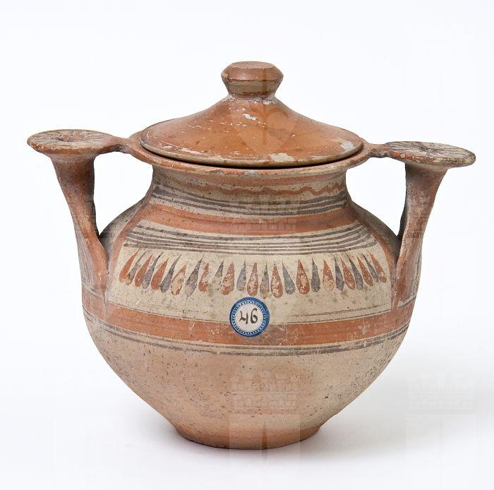 Olla con coperchio in ceramica messapica. Anse verticali in forma di scalpello unite al labbro mediante rotella, basso collo troncoconico a profilo convesso, corpo biconico, apoda a base piana. Decorazione bicroma in rosso e bruno su fondo di argilla naturale. Su entrambi i lati, sul collo, riquadro con motivo a tremulo e linee parallele; sulla spalla, riquadro con linee parallele e fascia di foglie lobate brune e rosse alternate; sul ventre, fascia rossa e linee brune; sulle rotelle, dipinte in rosso, giro di foglie in chiaro uscenti dal centro di esse, incavato; orlo e base interamente dipinti. Coperchio con pomello a sezione biconica, con estremità piatta.