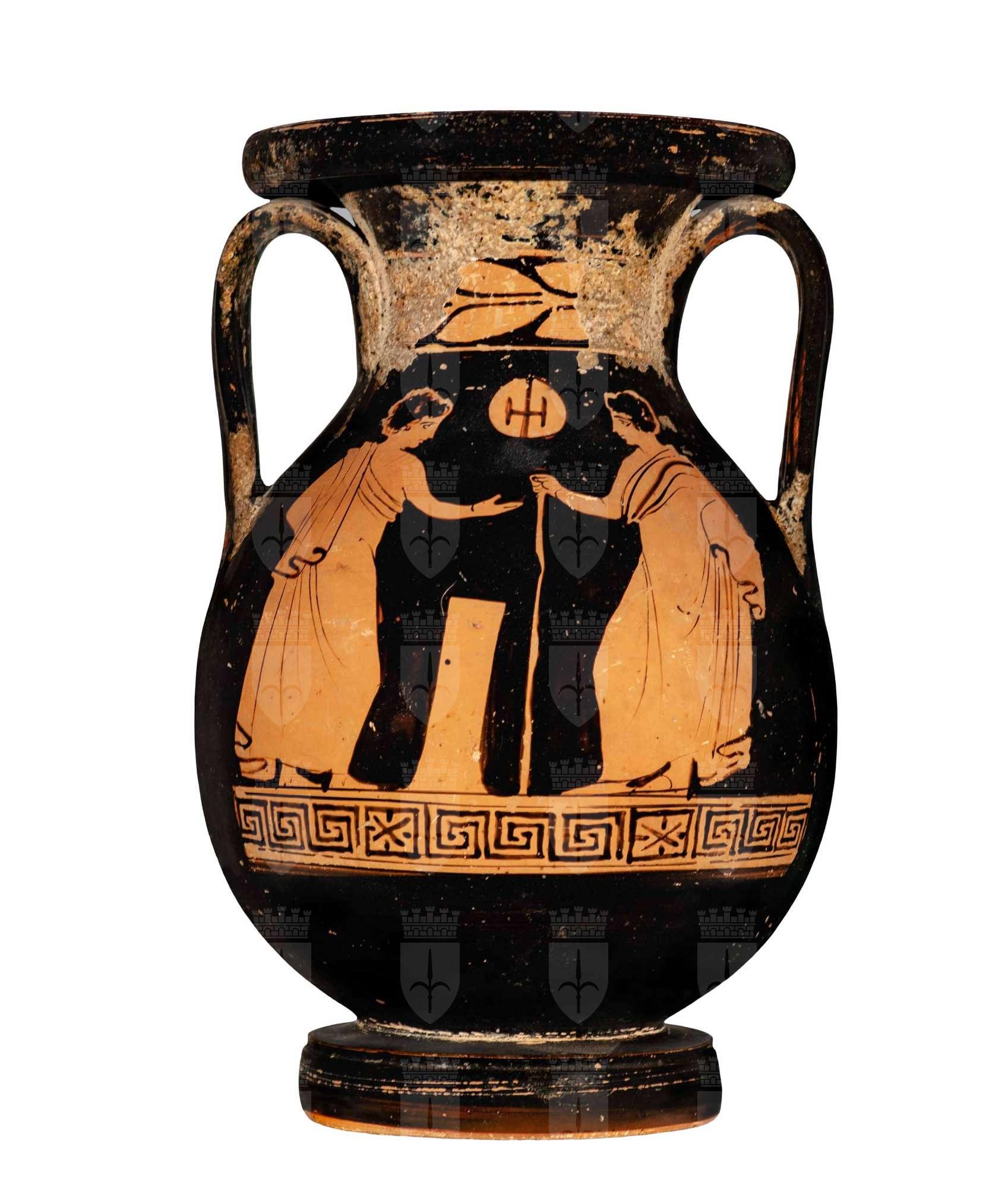 Pelike apula a figure rosse. Lato A: giovane nudo sdraiato con bastone, figura femminile stante con specchio, viticcio. Lato B: due giovani ammantati con bastone e pilastrino.