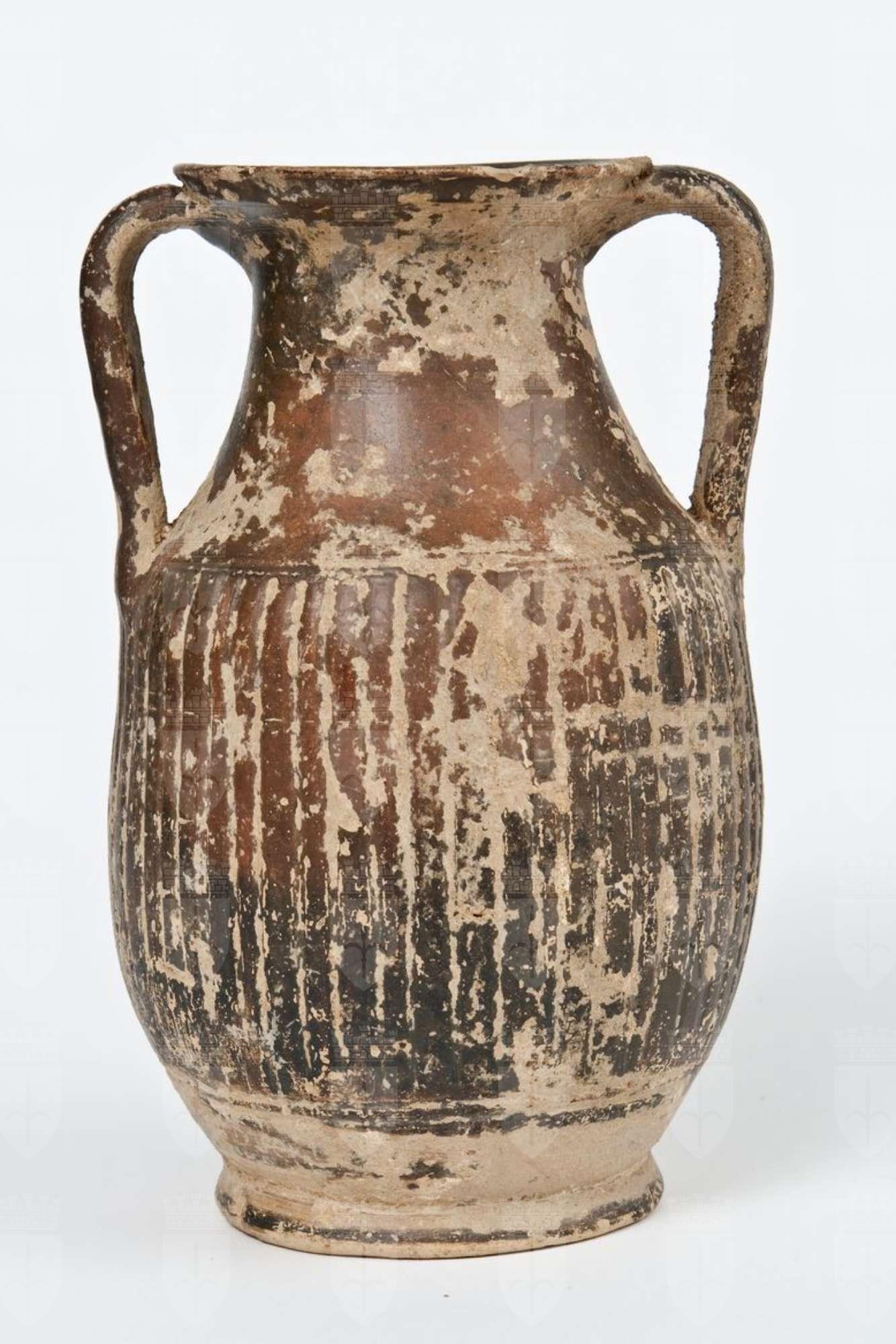 Pelike a vernice nera, tendente al rosso-bruno, sovraddipinta. Labbro leggermente revoluto, orlo estroflesso, corpo globulare strigilato, modanato alle estremità, anse a nastro verticali, piede ad anello. Le tracce in negativo di un’ipotetica onda è quanto rimane della decorazione.