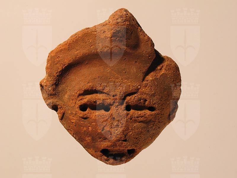 Applique antropomorfa di stile Usulután che ornava un vaso o altro contenitore di terracotta. Rappresenta un volto umano, piatto, leggermente rivolto verso l’alto. I tratti sono resi in modo approssimativo: il contorno ovale degli occhi è inciso, mentre le labbra, leggermente in rilievo, mostrano al centro due fori. Il naso è spezzato. Sopra la fronte è accennato un copricapo a fascia semicircolare con al centro una testa in rilievo. I tratti di questa non sono riconoscibili. La superficie esterna è rivestita da ingobbiatura di colore rosso bruno. La parte posteriore è leggermente arcuata.