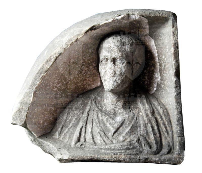 Angolo di coperchio a tetto di sarcofago a forma di acroterio con busto maschile che indossa tunica e mantello.