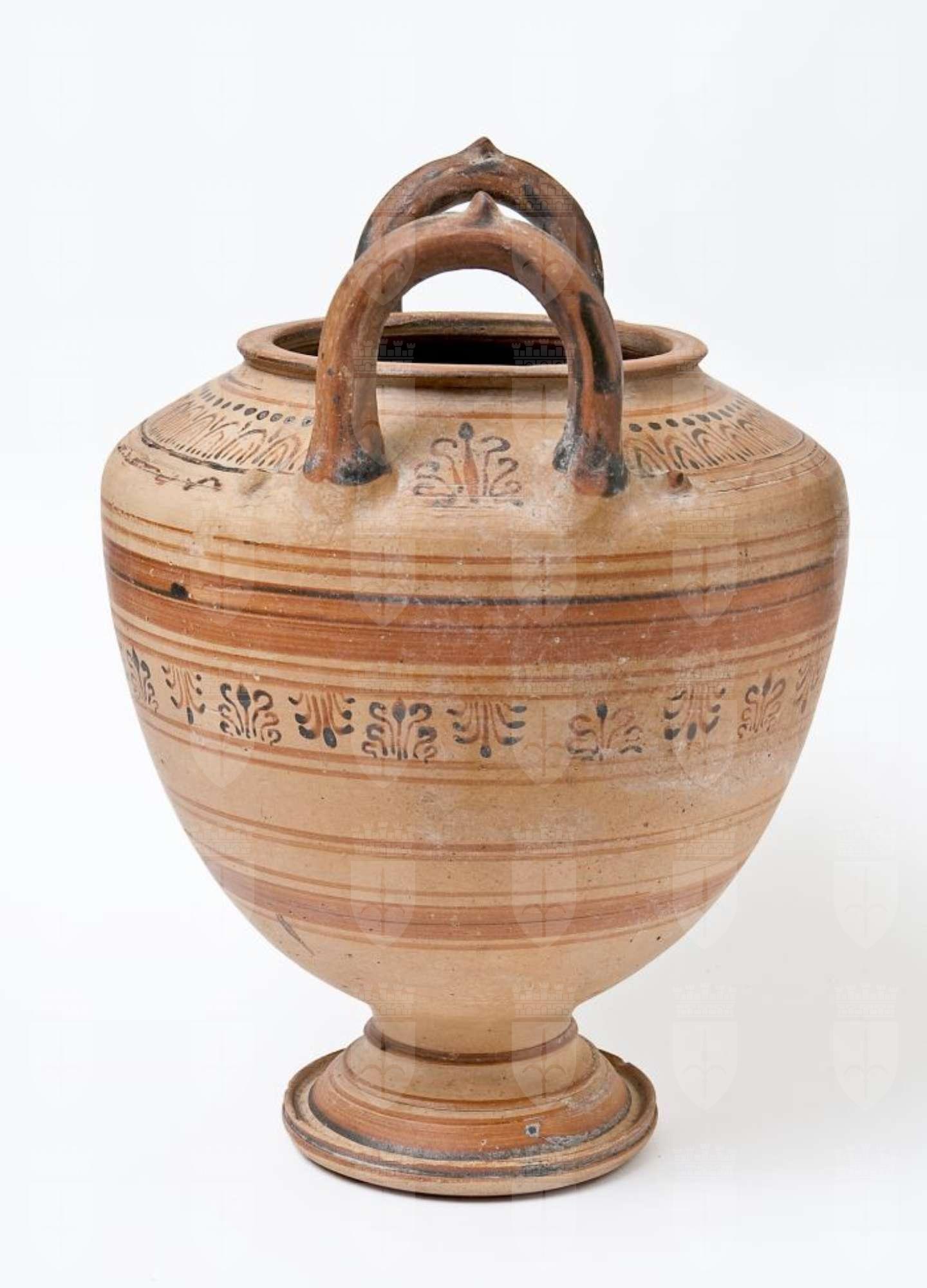 Stamnos con corpo globoso, rastremato verso il basso. Labbro svasato e orlo appiattito, larga imboccatura, anse verticali sormontanti impostate sulla spalla a profilo teso, con piede a tromba modanato con base a disco. Decorazione in bruno e rosso diluito, su fondo acromo: sulla spalla, un fregio inquadrato da due filettature e costituito da una fila di cerchi pieni e una di ovoletti a linee concentriche, separati da linee verticali, altre due linee concentriche parallele, con motivo a tremolo; sul corpo, linee e fasce di diverso spessore disposte sull’intera superficie, con fregio di palmette alternate; sul piede, linee e fasce di diverso spessore; dipinti l’orlo e le anse.