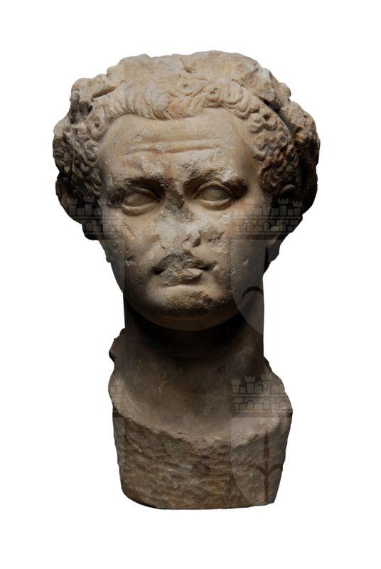 La testa di poco più grande del naturale presenta molte scheggiature e tracce tra i capelli della corona civica. Il volto è pieno e largo, la pelle levigata e tesa, la fronte alta e un poco stempiata, segnata da due sottili rughe incurvate nel mezzo. Gli occhi sono privi di pupilla e iride, le labbra carnose, il mento breve e un po' schiacciato. Le orecchie, carnose e ben modellate, non sporgono dalla massa dei capelli, che sono folti e si dispongono a ciocche lisce e in riccioli sulla fronte. La corona di foglie di quercia è resa in modo grossolano e i suoi nastri ricadevano lungo il collo taurino, lievemente piegato verso destra, poggiante su una base di forma troncoconica che doveva essere inserita in una statua. I particolari permettono di ipotizzare che la testa facesse parte di una statua imperiale loricata con braccio destro alzato. Sono evidenti, soprattutto sulla nuca, tracce di rilavorazione. "Che si tratti di un imperatore è indicato sia dalla grandezza superiore sia pur di poco al naturale, sia dalla corona civica, chiamata anche a cive servato o a cive servatore, che ben presto diviene un'onorificenza fissa dell'imperatore. ... Finora sono state avanzate diverse ipotesi d'identificazione: si è pensato a Claudio, a Tito, a Domiziano o ancora a Nerone rielaborato in Tito, infine a Domiziano o, più recentemente, Claudio ritrasformato in Costantino". Sulla base dei confronti proposti dal più recente studio sul teatro ora "si può concludere che la testa di Trieste rappresenta Tito in un'iconografia elaborata prima del 79, mentre alcuni indizi potrebbero far pensare che il ritratto sia stato ricavato da un precedente Nerone di un tipo formatosi nel 64 circa". Le statue degli imperatori ebbero una funzione indispensabile negli edifici teatrali romani: esse simboleggiavano la presenza fisica del sovrano e venivano poste o nel sacello in summa cavea, o nella scena sopra la porta regia, o in un tempietto nel portico posteriore, luogo quest'ultimo del rinvenimento di questa testa.