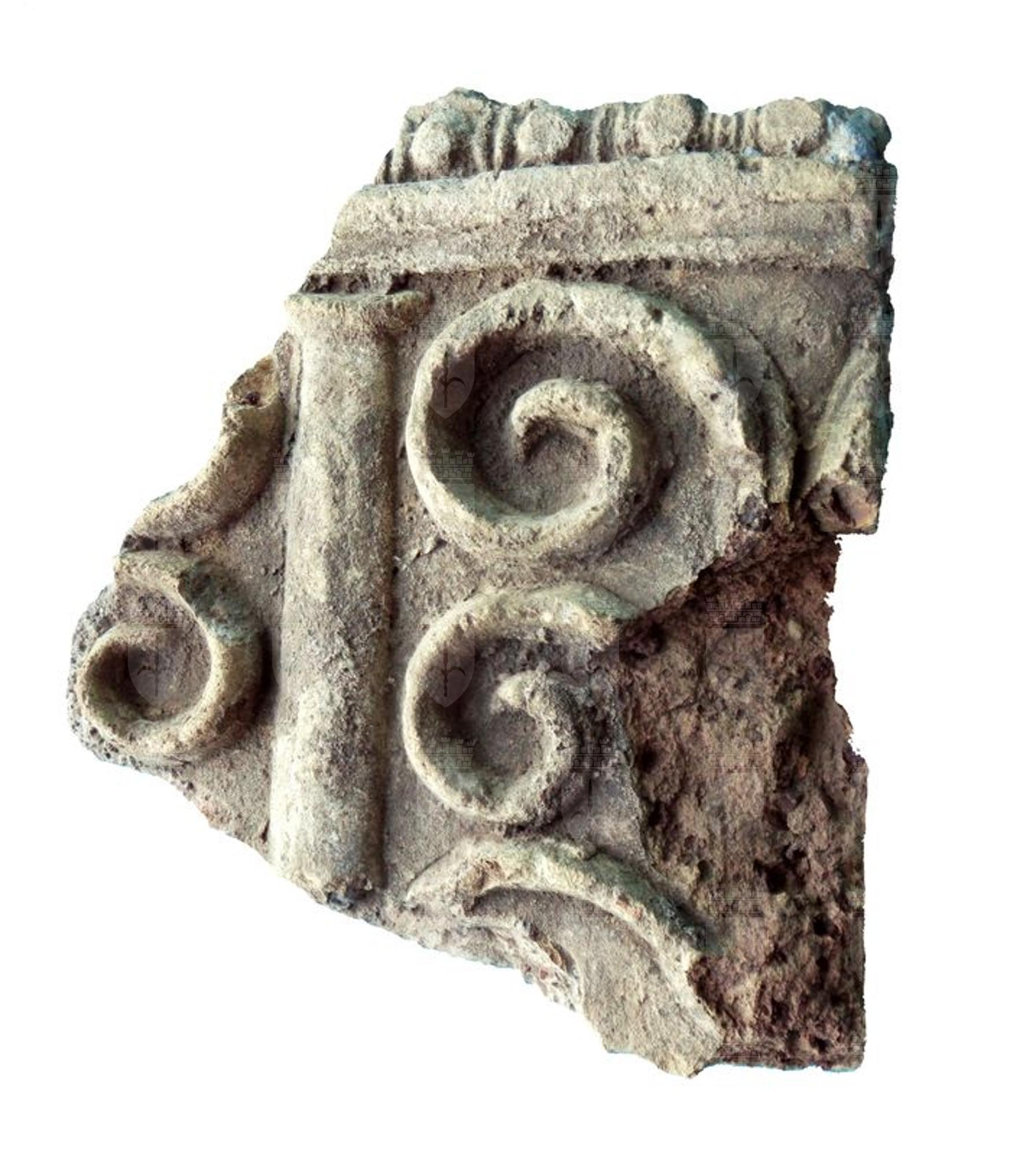 Il frammento probabilmente di sima della parte superiore di una lastra lacunoso su tre lati, della quale rimane l'echino e parte di una colonna a fusto liscio, incorniciata su entrambi i lati da due spirali. Sul margine destro si intravede la punta della lancia. Tracce di colore azzurro.
