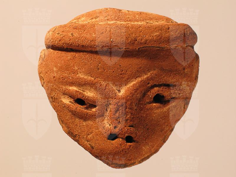 Rappresentazione schematica, di stile Usulután, di un volto umano realizzato in terracotta rossa. Il viso, di forma triangolare, è quasi piatto. Su questo sono ben delineate le due arcate sopracciliari; gli occhi mostrano un foro centrale al posto dell’iride e palpebre sporgenti. Poco sotto al naso si notano due fori ravvicinati. La bocca non è definita. La fronte è cinta da una fascia orizzontale in rilievo. Sono ancora presenti, specie nelle scanalature, tracce di pittura bianca e nera. Nella parte posteriore della testa è presente un largo intacco.