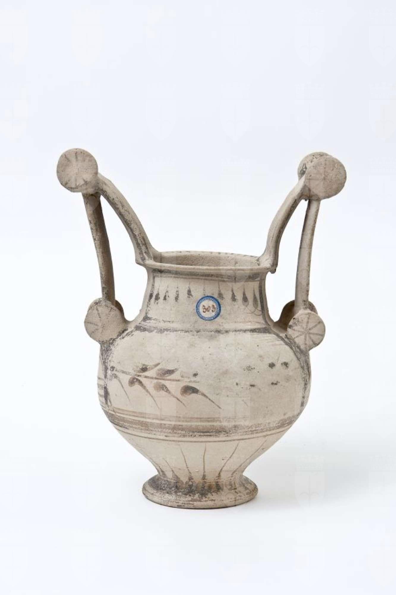 Trozzella in ceramica messapica. Orlo estroflesso e appiattito, basso collo troncoconico, a profilo leggermente convesso, corpo globoso rastremato verso il basso, con anse verticali sormontanti, impostate sull’orlo e sulla spalla, provviste di doppia coppia di dischi (“trozze”), di cui quelli superiori sono di maggiori dimensioni; basso piede a disco. Decorazione monocroma in nero su fondo naturale di argilla; su entrambi i lati, pannelli sul collo e sulla spalla inquadrati da fasce parallele, in cui campeggiano tralci d’edera stilizzati; sull’orlo, tratti; nella parte inferiore del vaso, raggiera di petali.