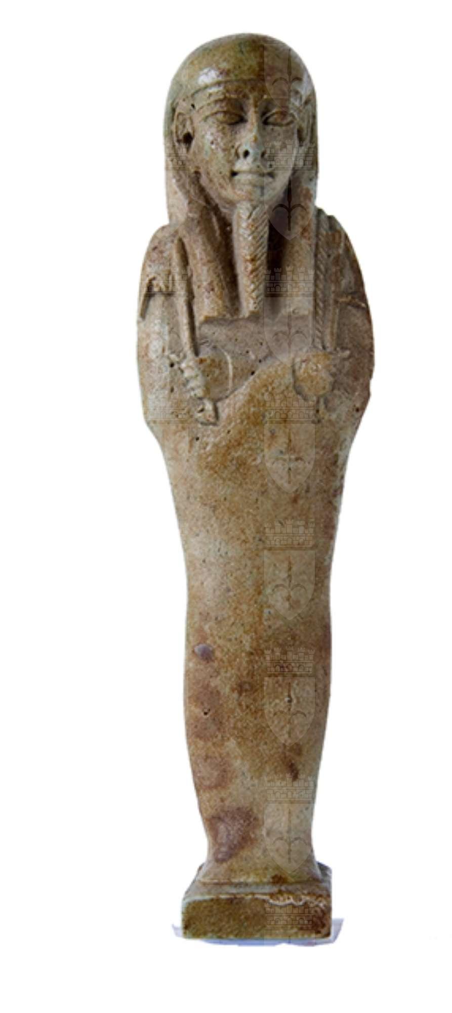 Statuina funeraria mummiforme che indossa una parrucca tripartita e la barba divina intrecciata. Le mani incrociate, la destra sopra la sinistra, portano rispettivamente una zappa e un piccone. Dalla spalla sinistra pende una sacca, i cui dettagli fanno intuire che si intendeva rappresentare una cesta in vimini intrecciati. Il pilastro dorsale è presente e continua a formare una piccola base sotto i piedi. L’ushabti è privo di iscrizioni.