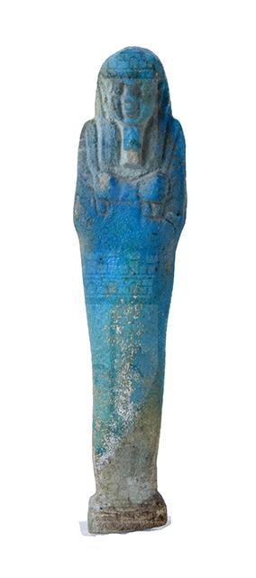 Statuina funeraria mummiforme che indossa barba divina e parrucca tripartita, la quale continua dietro direttamente con il pilastro dorsale; è presente una piccola base sotto i piedi. Le mani incrociate ed affiancate portano ciascuna una zappa. Dalla spalla sinistra pende una sacca. L’iscrizione corre lungo una colonna sul pilastro dorsale.