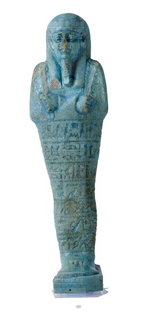 Statuina funeraria mummiforme che indossa una parrucca tripartita e la barba divina intrecciata. Le mani incrociate, la destra sopra la sinistra, tengono ognuna una zappa. Dalla spalla sinistra pende una sacca. Il pilastro dorsale e la base sotto i piedi sono presenti. L’iscrizione si sviluppa su sette righe attorno al corpo e alle gambe dell’ushabti e riporta il testo del capitolo 6 del Libro dei Morti. Interessante è il fatto che alcuni segni del testo sono stati scritti sul lato del pilastro dorsale e sui piedi per mancanza di spazio.