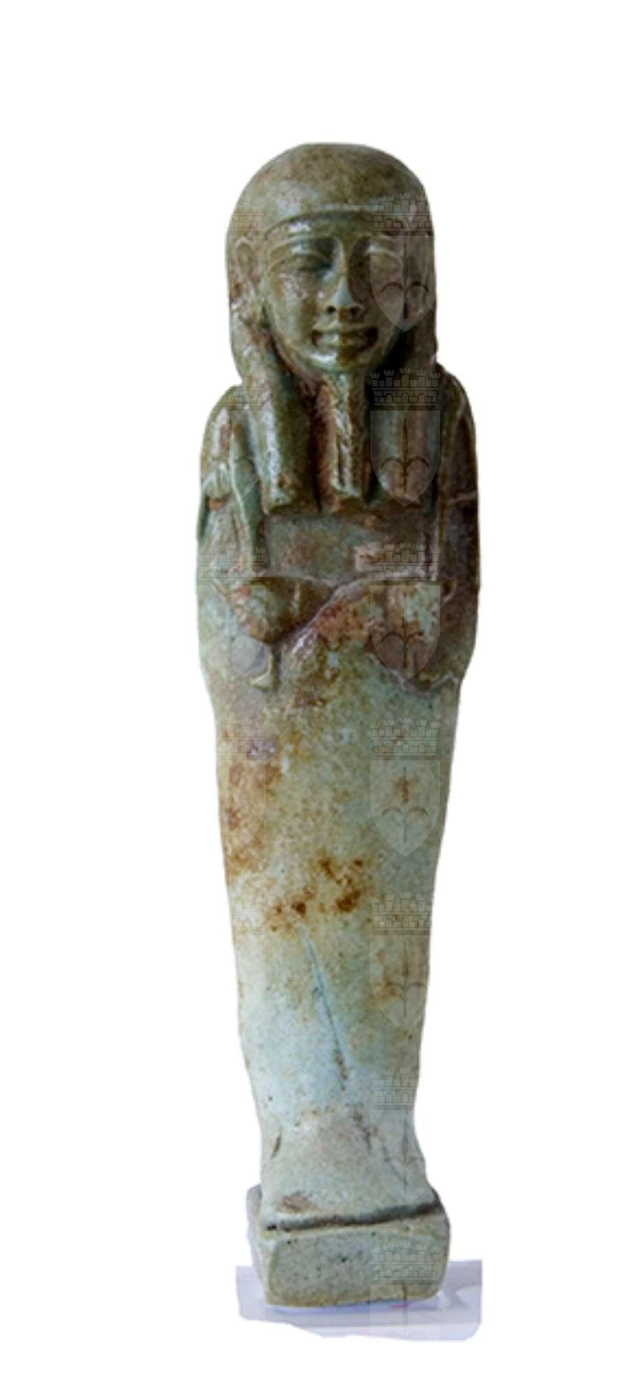 Statuina funeraria mummiforme che indossa una parrucca tripartita e la barba divina intrecciata. Le mani incrociate, la destra sopra la sinistra, portano rispettivamente una zappa e un piccone. Dalla spalla sinistra pende una sacca. Il pilastro dorsale e la base sono presenti. L’ushabti è privo di iscrizioni.