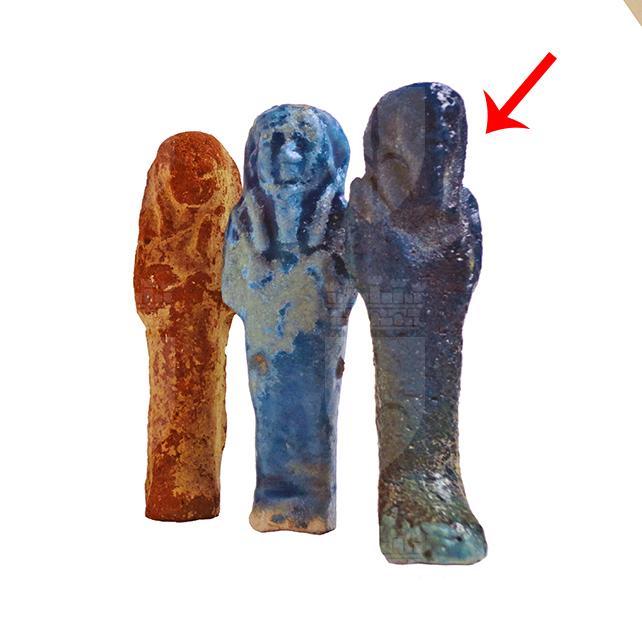 Statuina funeraria mummiforme che indossa la barba divina e una gonfia parrucca tripartita, la quale è stata rifinita nella parte posteriore. Le mani incrociate portano una zappa e forse una frusta. Dalla spalla sinistra pende una sacca. L’ushabti è privo di iscrizioni e date le ridotte dimensioni potrebbe essere stato usato come amuleto.