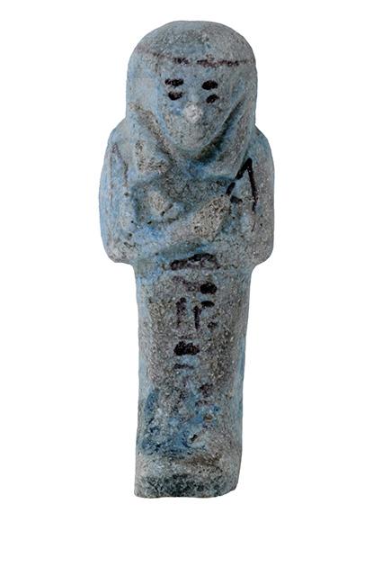 Statuina funeraria mummiforme che indossa una parrucca tripartita con seshed. Le braccia sono incrociate, la destra sopra la sinistra, e le mani tengono ognuna una zappa. Sulla schiena, una sacca centrale è sostenuta da due bretelle. I dettagli sono dipinti in nero. L’iscrizione sul davanti delle gambe è dipinta in nero e consta di una singola colonna di testo, poco leggibile