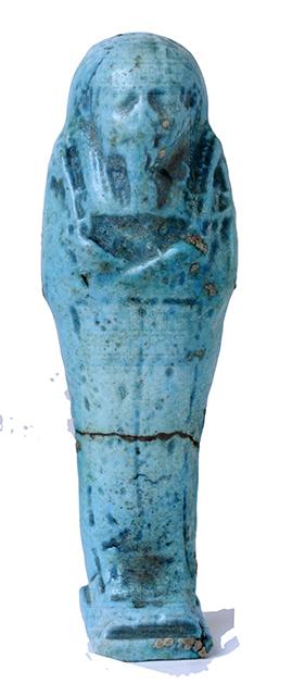 Statuina funeraria mummiforme che indossa barba divina e parrucca tripartita che continua con il pilastro dorsale. Le mani sono incrociate, la destra sopra la sinistra, e tengono rispettivamente una zappa e un attrezzo non identificabile per il deterioramento. Dalla spalla sinistra pende una sacca. I piedi poggiano su una base molto piccola. Sul davanti delle gambe si intuisce la presenza di un’iscrizione distribuita su due colonne affiancate, completamente illeggibile, mentre sul pilastro dorsale si trova un’altra colonna di iscrizione.
