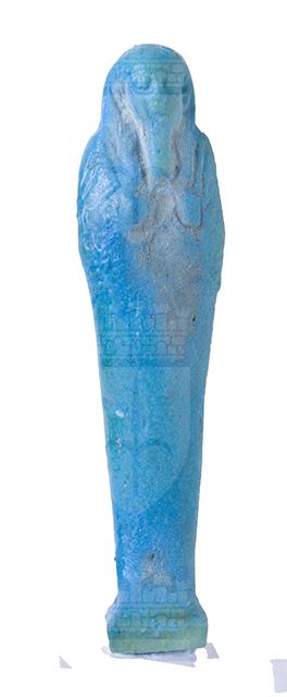 Statuina funeraria mummiforme che indossa la barba divina e una parrucca tripartita, la quale continua dietro direttamente con il pilastro dorsale. Le mani incrociate ed affiancate tengono ognuna una zappa; i piedi poggiano su una piccola base. Dietro la spalla sinistra si intravede una sacca. L’ushabti è privo di iscrizioni.