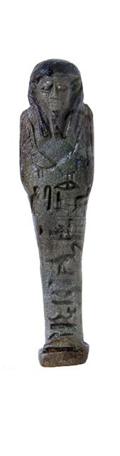 Statuina funeraria mummiforme che indossa una parrucca tripartita e la barba divina, dipinte in nero. Le mani incrociate, la destra sopra la sinistra, portano ognuna una zappa. Dalla spalla sinistra pende una sacca. Il pilastro dorsale e la base sono presenti. L’iscrizione è composta da una riga orizzontale e da una colonna, a formare una specie di T senza cornice sul davanti delle gambe.