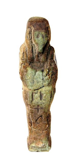 Piccola statuina funeraria mummiforme, con parrucca tripartita e corta barba divina. Le mani sono incrociate sul petto e affiancate, e reggono ciascuna una zappa. Il retro è piatto ma sotto i piedi è presente una piccola base. Le iscrizioni sono in colonna, sia davanti che sul retro, nonché - fatto insolito - sotto i piedi, ma non sembrano avere senso.