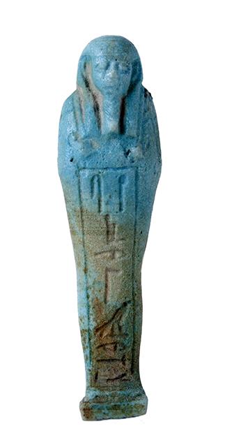 Statuina funeraria mummiforme che indossa una parrucca tripartita e la barba divina intrecciata. Le mani sono incrociate e affiancate: nella destra tiene una zappa e nella sinistra un piccone. Dalla spalla sinistra pende una sacca. Il pilastro dorsale è presente e forma un tutt’uno con una piccola base. L’iscrizione corre lungo una colonna frontale.