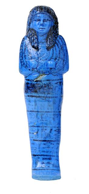 Statuina funeraria mummiforme che indossa un collare ed un’elaborata parrucca doppia. Le mani incrociate e affiancate sono senza attrezzi. Sulla schiena si vedono un bilanciere con due fiaschette ed un sacchetto che pende dalla spalla destra. Al centro, dietro le gambe, una decorazione con motivo a reticolo. Tutti i dettagli sono stati dipinti in nero, come anche l’iscrizione, che è disposta su sei righe. Benché poco leggibile, si riesce a capire che il testo è quello del capitolo 6 del Libro dei Morti. Da notare che nella prima riga il nome e i titoli del defunto sono stati cancellati con un rettangolo di inchiostro nero, mentre sopra la decorazione a reticolo dietro le gambe è stata aggiunta un’altra colonna di testo, purtroppo illeggibile, che forse riportava il nome di un nuovo proprietario.