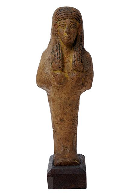 La statuina funeraria mummiforme indossa una parrucca tripartita con striature nere. Le mani sono incrociate una vicina all’altra, alla stessa altezza e senza attrezzi. L’ushabti è privo di iscrizioni.