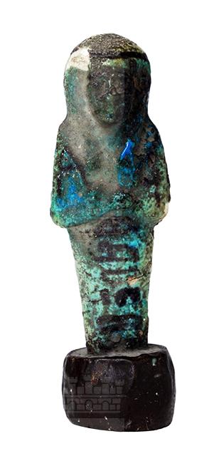Parte superiore di statuina funeraria mummiforme che indossa la parrucca tripartita con il seshed. Le braccia sono incrociate sul petto, la destra sulla sinistra, e le mani reggono entrambe una zappa. Dietro la spalla sinistra pende quella che sembra essere una zappa. Sotto le braccia parte la colonna di iscrizione, che non è completamente visibile dal momento che l'ushabti è irremovibilmente infisso in una base cilindrica non originale. Tutti i dettagli sono resi con dipintura in nero.