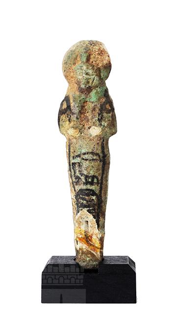 Statuina funeraria mummiforme, di manifattura alquanto grossolana. L'ushabti presenta la parrucca tripartita, sulla quale sono stati posti un cobra ureo e un disco solare. Le braccia sono incrociate sul petto, con le mani affiancate che reggono ciascuna una zappa dipinta in nero. Lungo le gambe vi è una colonna di iscrizione dipinta anch'essa in nero, di difficile lettura a causa della cattiva grafia dei segni e della scomparsa di parte di essi a causa di una scheggiatura, anche se sembra di intravedere un cartiglio, il che indurrebbe a pensare trattarsi di un ushabti di un personaggio regale.