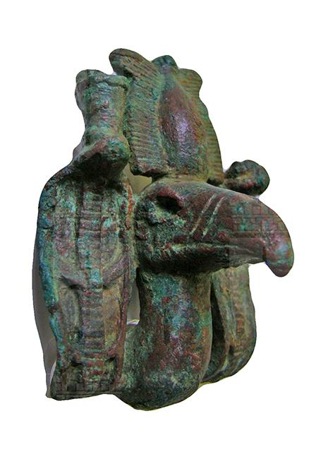 Applique in bronzo conformata a testa di avvoltoio con corona doppia, affiancato da due urei con disco solare, il cui corpo doveva originariamente essere decorato da paste vitree policrome. Era probabilmente applicata in corrispondenza della fronte ad una corona, reale o scolpita come parte di una statua a grandezza naturale o poco maggiore del vero.