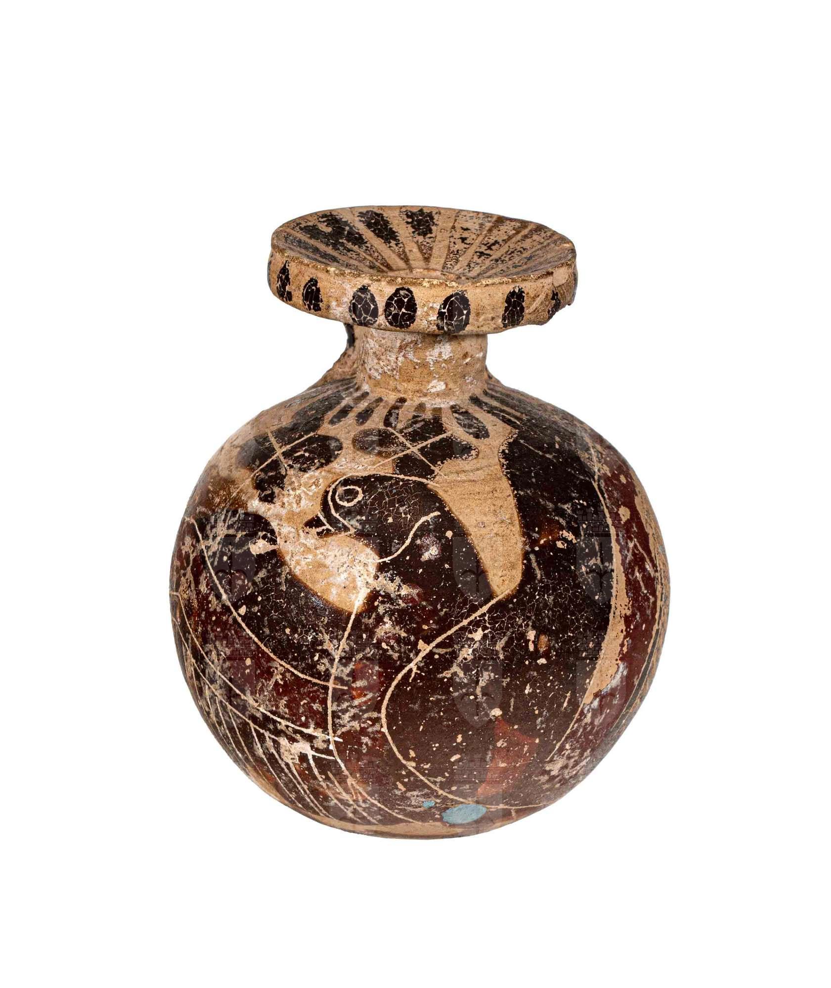 Aryballos corinzio con uccello verso sinistra, forse un gallo ad ali spiegate; nel campo rosette, sul fondo raggiera di petali.
