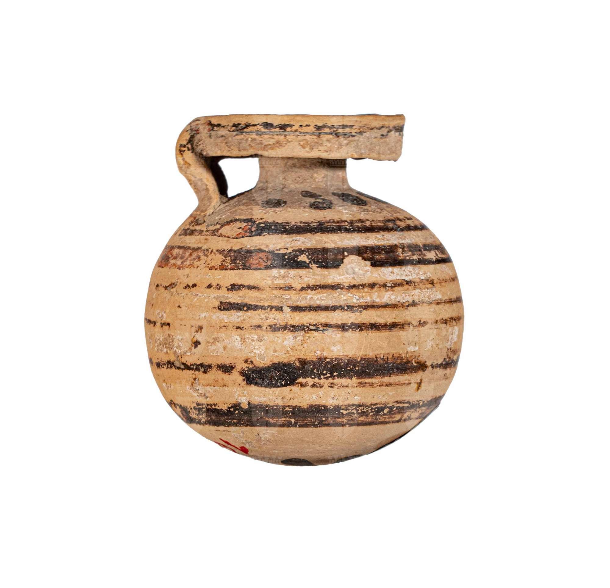 Aryballos corinzio a fasce brune sul ventre e sull'orlo, con poche foglie lungo il collo ed alla base.