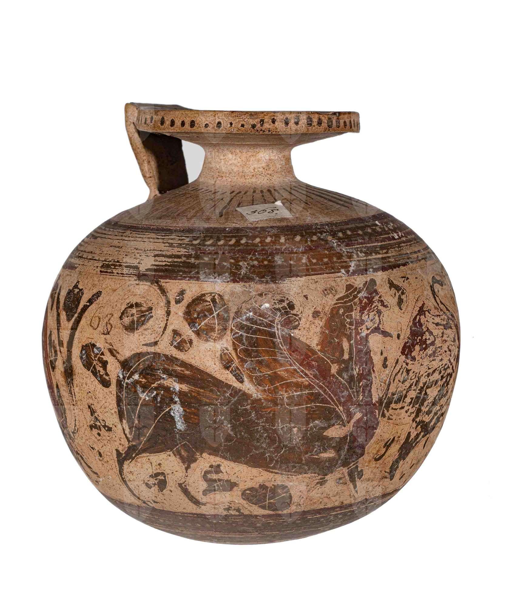 Aryballos etrusco-corinzio con ansa piatta e immagine di due sfingi a testa maschile con barba, affrontate con in mezzo un cigno; stambecco pascente e rosette. Superiormente e inferiormente decorazione a fasce di colore diverso alternate e puntini gialli. Base, spalle e labbro espanso con baccellatura.