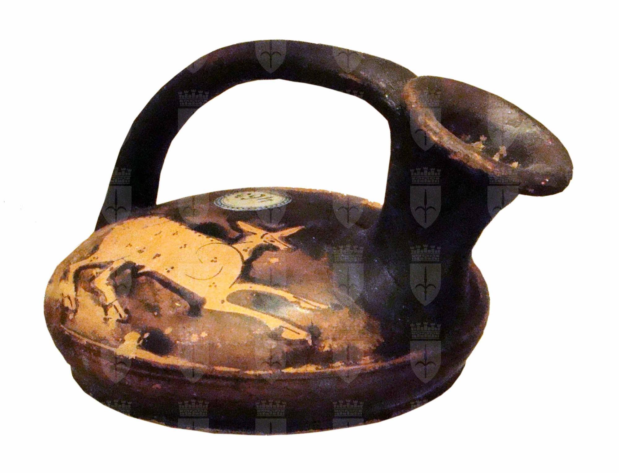 Bocchello laterale con orlo estroflesso e arrotondato; corpo circolare, lenticolare, con ventre fortemente compresso; ansa a nastro sovrapposta impostata tra collo e corpo. Lato A: sfinge accovacciata Sulla d. sfinge ritratta accovacciata, di profilo verso destra; i capelli a vernice nera diluita sono raccolti; l’occhio è reso con il dettaglio di sopracciglio, rima superiore e inferiore coincidenti all’estremità esterna e con pupilla a tratto verticale. Le ali sollevate verso l’alto presentano un piumaggio differente su due registri: la parte superiore puntinata a vernice bruna; quella inferiore con serie di linee verticali. Lato B: cerva in movimento di profilo Sulla s. cerva ritratta di profilo in movimento verso destra; la testa è leggermente più piccola e sproporzionata; il manto è decorato con gruppi di tre puntini a vernice nera; le zampe con zoccoli sono profilate in nero.