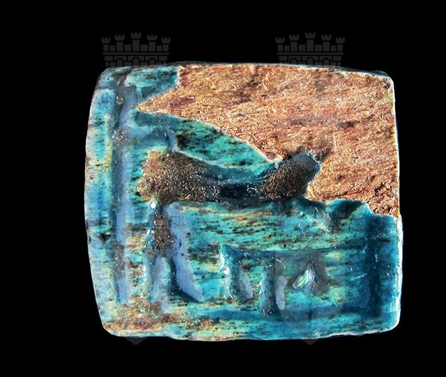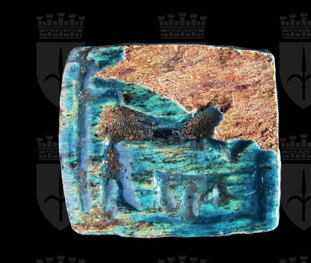Piastra rettangolare in steatite invetriata turchese; Su una faccia sono presenti un cartiglio indecifrabile disposto verticalmente ed un falco con corona e flagello. Sull’altra, forse un animale (non ben visibile a causa della scheggiatura dell’angolo) ed alcuni segni. Foro passante longitudinale.