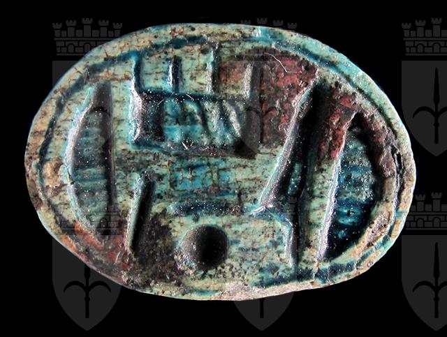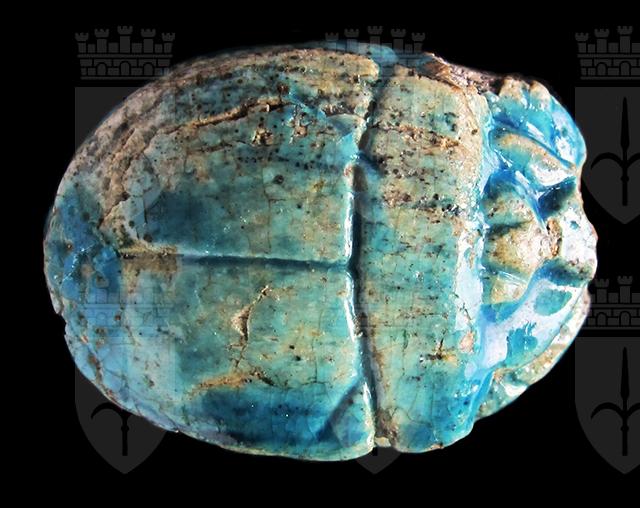 Scarabeo in steatite invetriata turchese con sul ventre incisione del nome di Amon-Ra tra due segni neb, disposto orizzontalmente. Dorso con clipeo, incisione a T che separa protorace ed elitre, le quali presentano piccole tacche a V. Foro passante longitudinale.