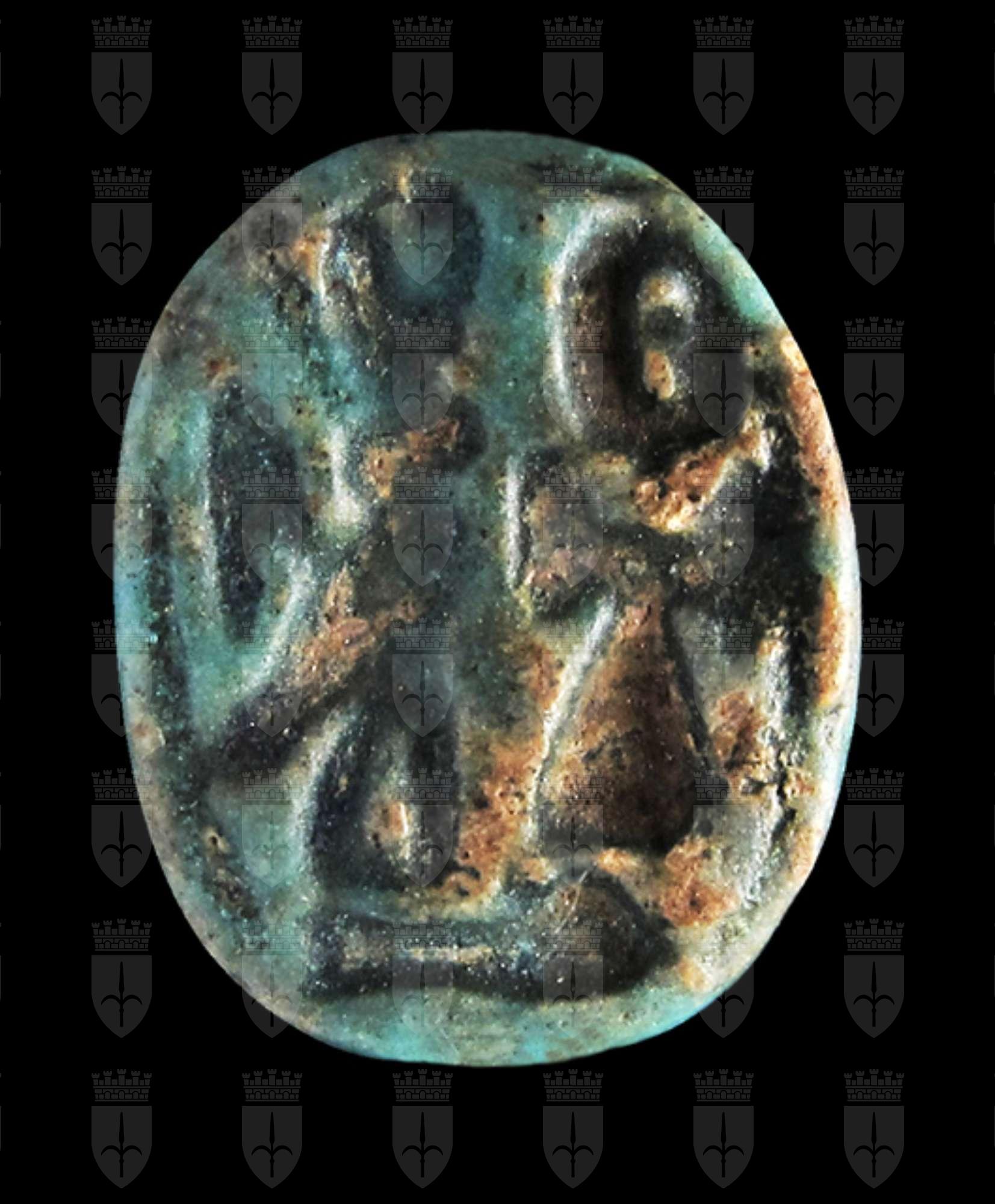 Scarabeo in steatite invetriata turchese con sul ventre incisione che rappresenta un segno ankh davanti al dio Horo in forma di falco con flagello e disco solare sulla testa. Dorso molto semplice con incisione del solo clipeo. Foro passante longitudinale.