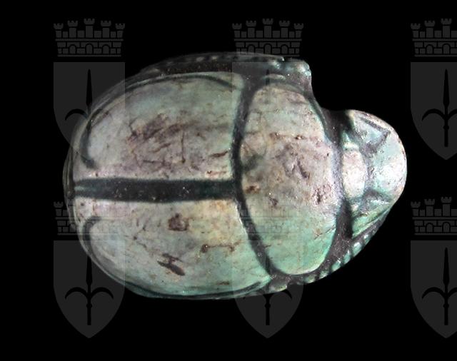Scarabeo in steatite invetriata azzurra con sul ventre incisione del nome di Amon-Ra all’interno di un ovale, sulla sinistra un segno neb con funzione di riempitivo. Dorso con clipeo sulla testa e incisione a T che separa il protorace dalle elitre, che presentano terminazioni a “ricciolo”. Foro passante longitudinale.