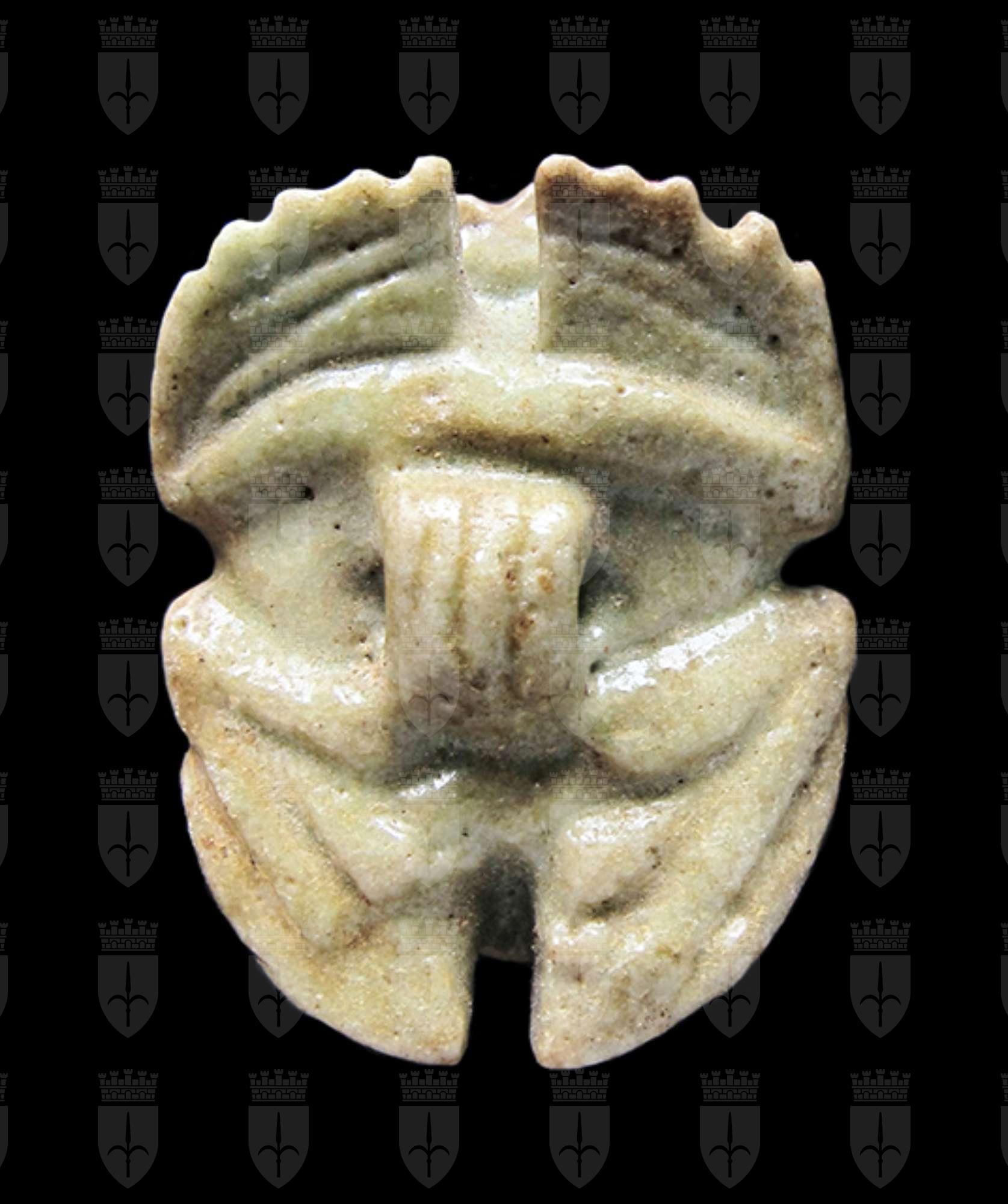 Scarabeo zoomorfo in faience verde. Dorso con clipeo e lavorazione ondulata sulla testa, visibile anche dal ventre; elitre non separate, con zigrinature verticali. Ventre con le zampe ripiegate ed una piccola presa trasversale al centro.