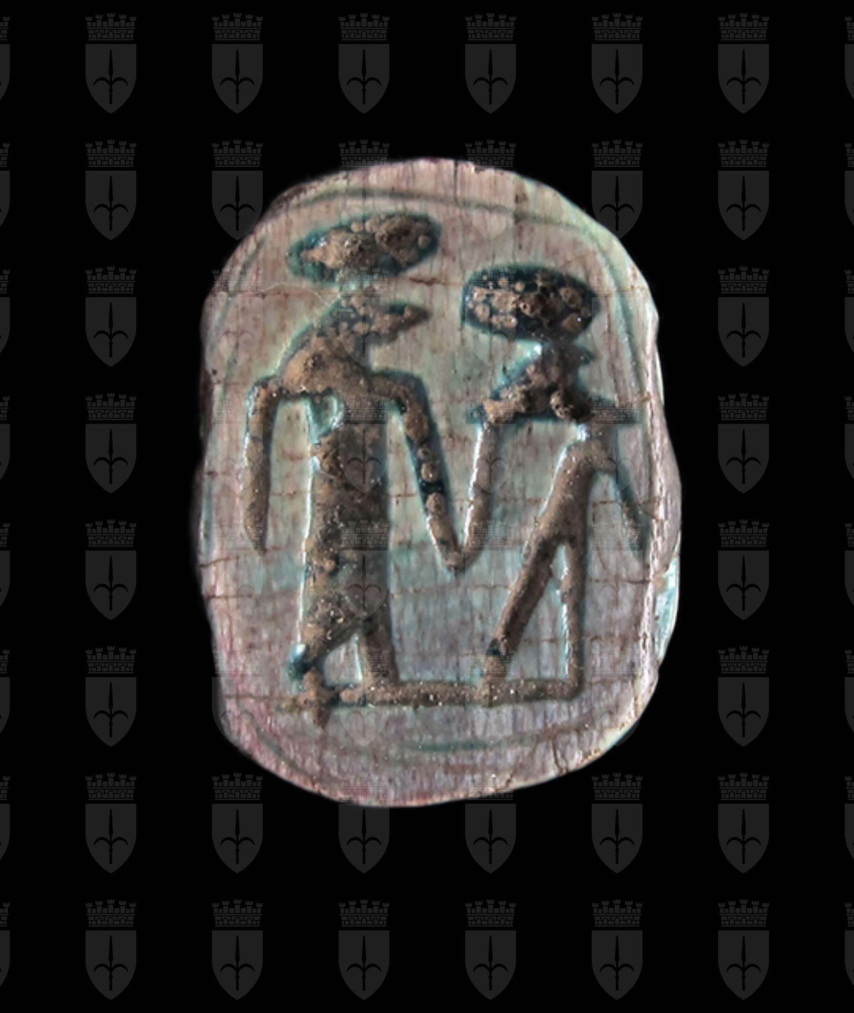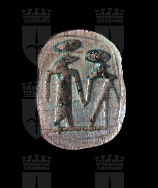 Scarabeo in steatite invetriata turchese con sul ventre incisione che rappresenta due divinità, con disco solare sopra il capo, che si tengono per mano. Dorso con incisione di clipeo, protorace ed elitre, sulle quali sono presenti tacche a V. Foro passante longitudinale.