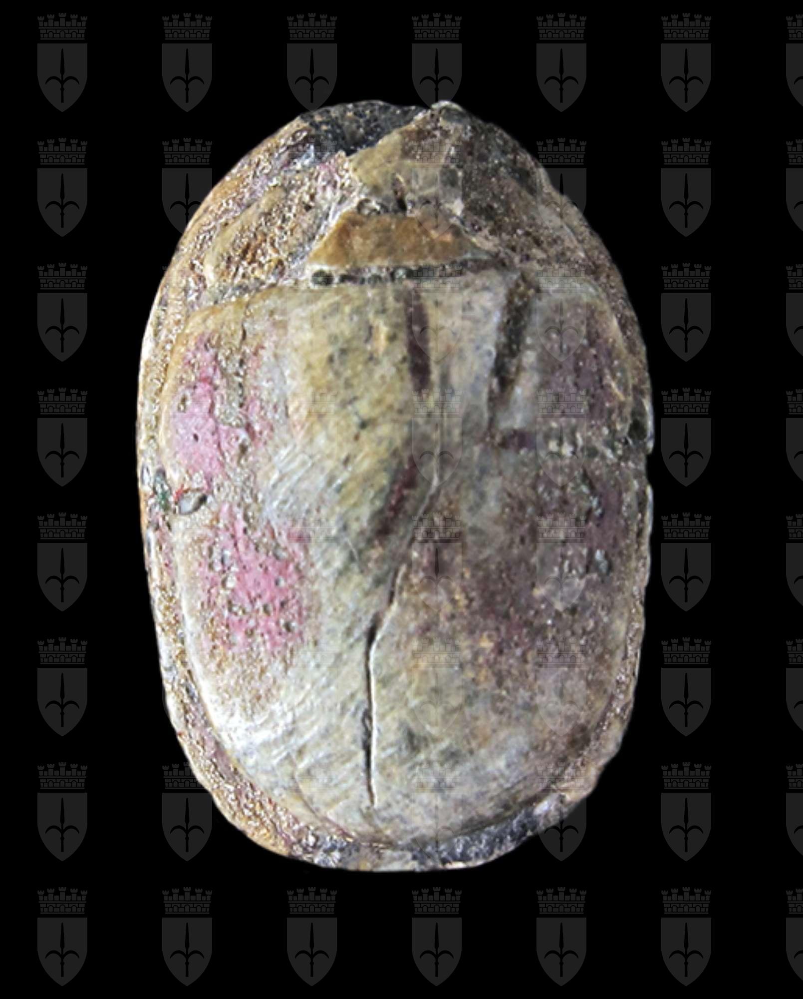 Scarabeo in steatite grigia, con sul ventre incisione di motivo geometrico con schema a croce, alle cui estremità vi sono dei fiori di loto. Sul dorso è segnata solo la testa con il clipeo. Foro passante longitudinale.