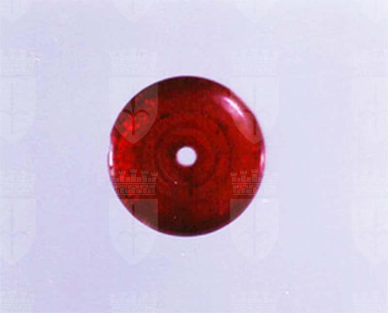Dischetto in ambra dorata con due facce convesse ai bordi e concave al centro, con foro centrale. Decorata con doppia e tripla incisione concentrica sulle due facce.