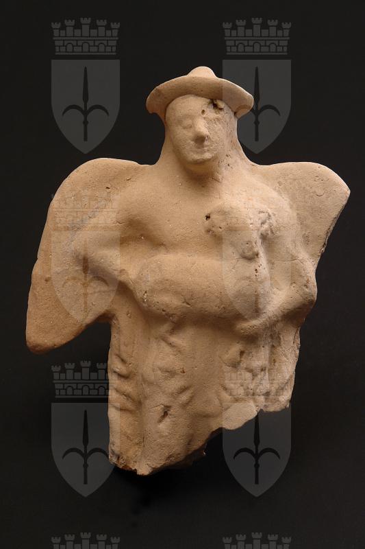 Figura molto appiattita, maschile alata di prospetto che regge davanti al petto un piccolo ariete afferrandolo per le zampe anteriori e da tergo. Il volto è ovale, gli occhi e il naso sono sporgenti, la bocca piccola Indossa un mantello drappeggiato, forse sopra un corto chitone; e, lavorato a parte, un copricapo a punta, il petaso; fissate al dorso, un paio di ampie ali piatte.