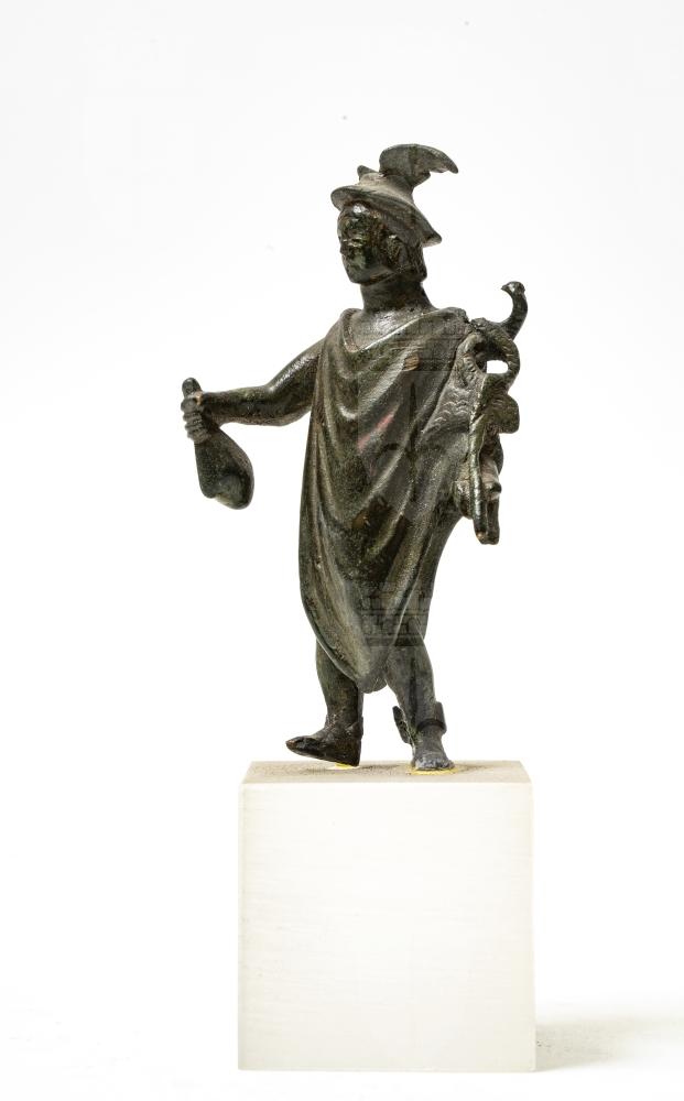 Statuetta di Mercurio appoggiato sulla gamba destra avanzata. Veste un mantello allacciato sulla spalla destra che scende in lembi davanti e dietro sino alle caviglie alate. La mano destra sporge avanti con in pugno una borsa, la sinistra regge il caduceo. Il capo è adorno di pètaso.